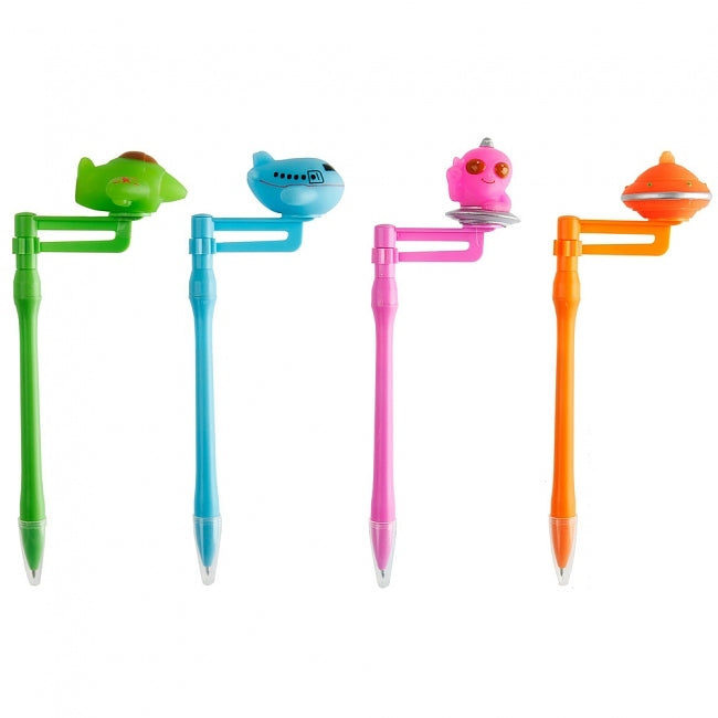 Überirdischer Stift mit Kulimine und verschiedenen Figuren, z.b. Alien, Ufo oder Space Shuttle. Der Kugelschreiber ist mit einer LED beleuchtet. Die Figur kann man fröhlich im Kreis drehen und somit die Flugobjekte fliegen lassen.