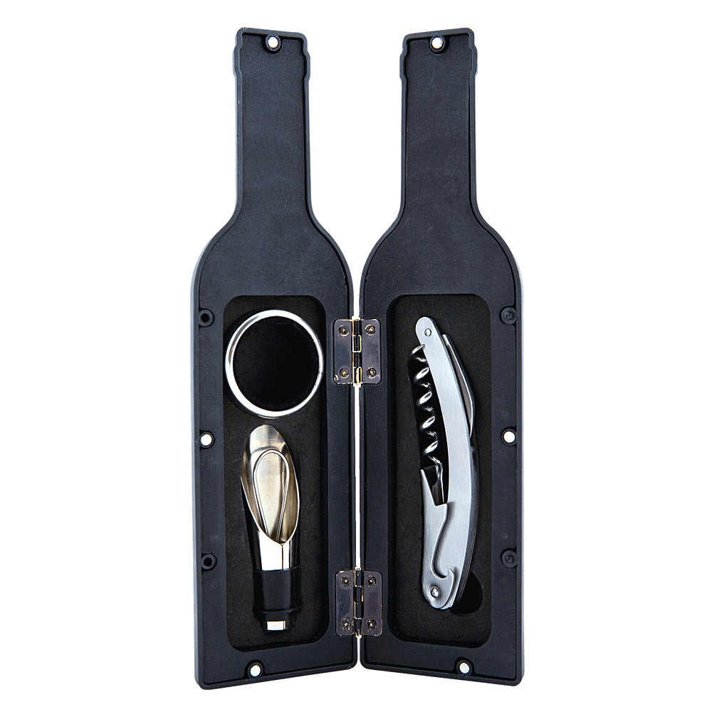 Mit diesem Weinzubehör-Set im Flaschendesign haben Sie alle Utensilien für ein perfektes Dinner zur Hand. Enthalten sind ein Korkenzieher inkl. Messer, ein Ausgießtrichter und ein Weinring. Das Geschenkset Open The Bottle kommt bei Weinliebhabern stets gut an.
