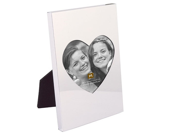 Glänzender Alurahmen in Herzform, für Fotos im Format 10 x 15 cm (Bildausschnitt ca. Breite 11,5 x Höhe 9,5 cm), zum Aufstellen.
