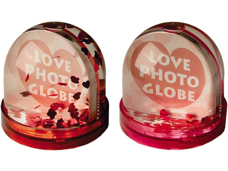Schneekugel mit roten Flitterherzen. Man nimmt einfach den Deckel an der Unterseite ab und kann dann auf der Vorder- und Rückseite ein romantisches Foto einfügen. So ist dieser Fotorahmen eine süße Geschenkidee zum Valentinstag und Jahrestag.
