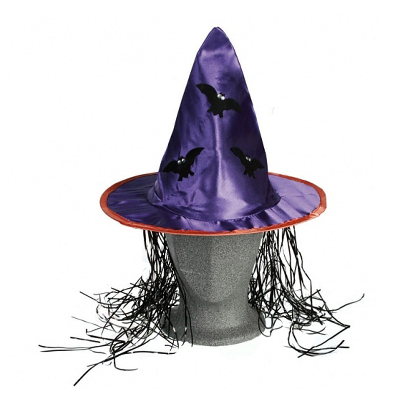 Schicker Hut fürs perfekte Hexenkostüm aus lilafarbenem Satinstoff, bestückt mit kleinen Fledermäusen und Fransen. Dieses Accessoire komplettiert schnell und einfach das Hexen-Faschingskostüm.